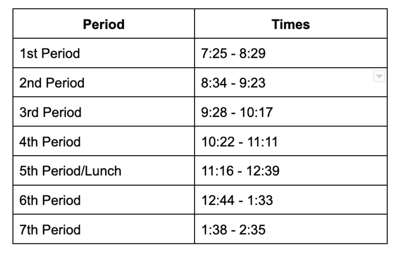 I want to thank you all for your patience and grace as we work to improve our current bus situation. We will continue to work on what we can control within our building to help. To ensure that students are not missing instructional time in content areas when buses arrive later than expected, we will be making an adjustment to our bell schedule. Moving forward, advisory lessons will take place as an extended part of first period. We will begin using this schedule on Monday, August 28th and it will be our schedule for Monday through Friday.